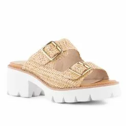 This comfortable slip-on shoe has a double strap sandal placed atop a chunky, lug-sole block heel, giving it a fierce appearance and retro feel.