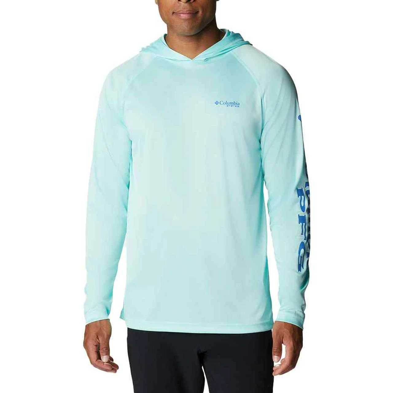 This performance men’s hoodie from Columbia PFG is made from a soft heathered fabric with a sporty sleeve graphic, is sweat-wicking, provides UPF 50 protection, and is a comfortable tech tee for long days on the water.