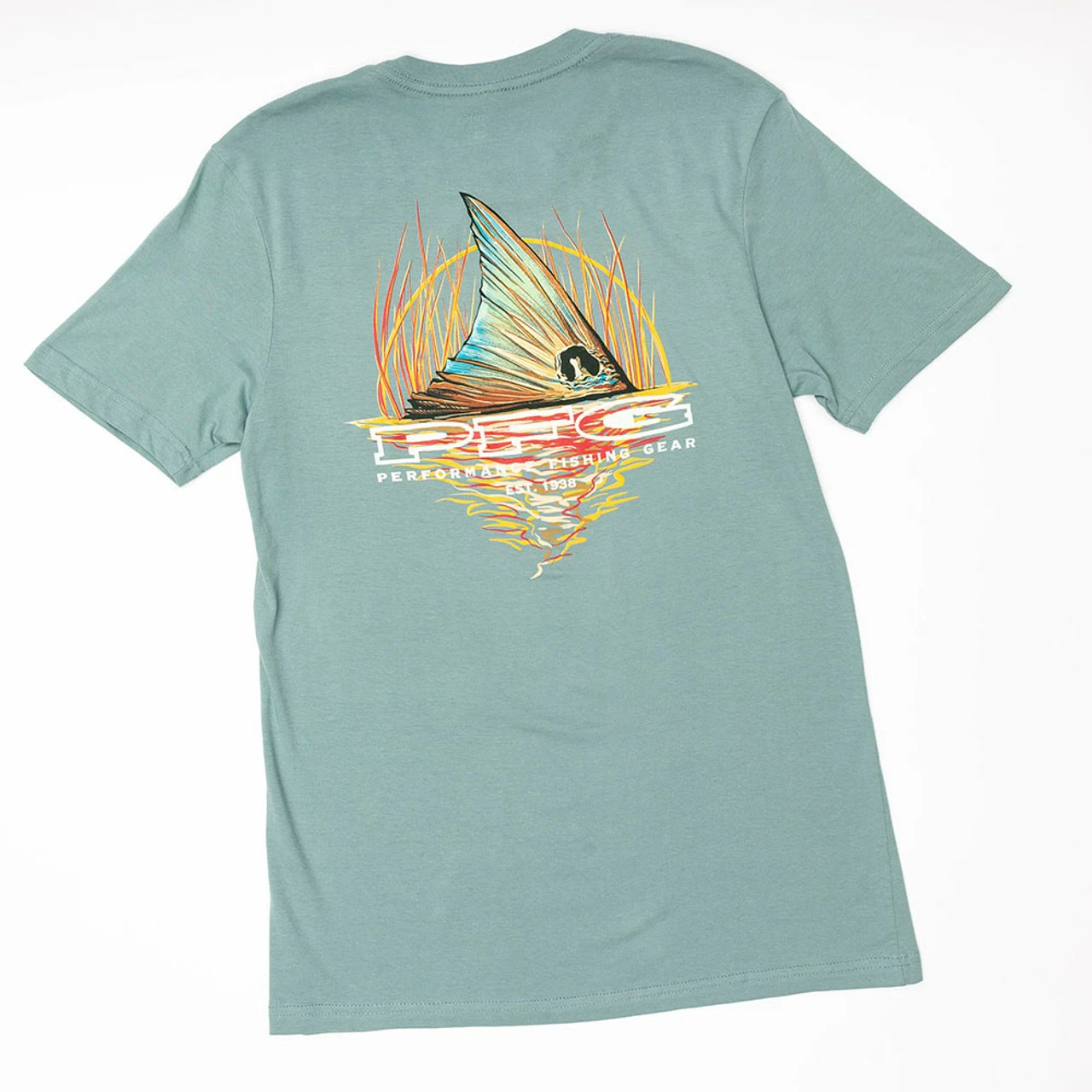 A comfortable men’s PFG tee featuring a large fin in sunset colors.
