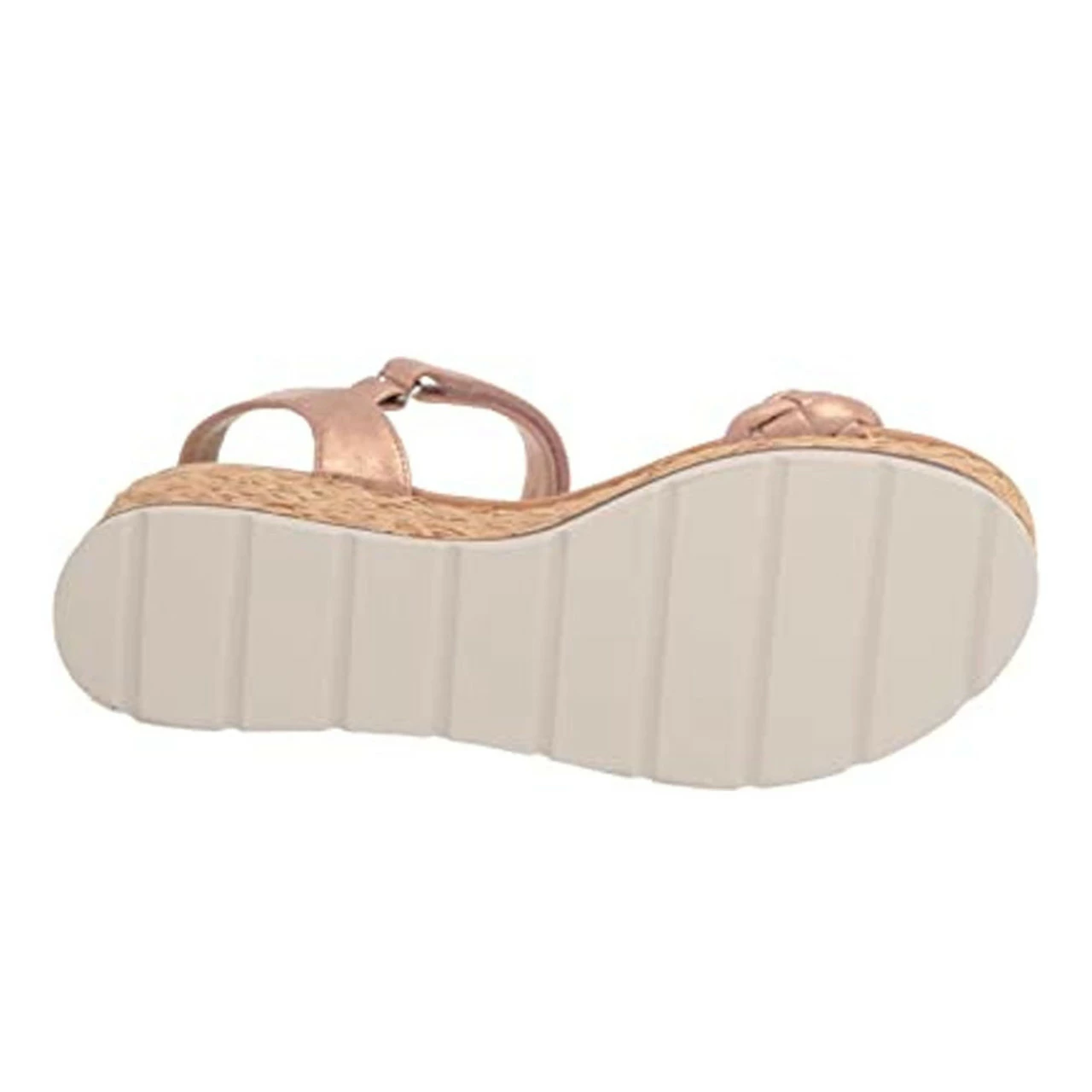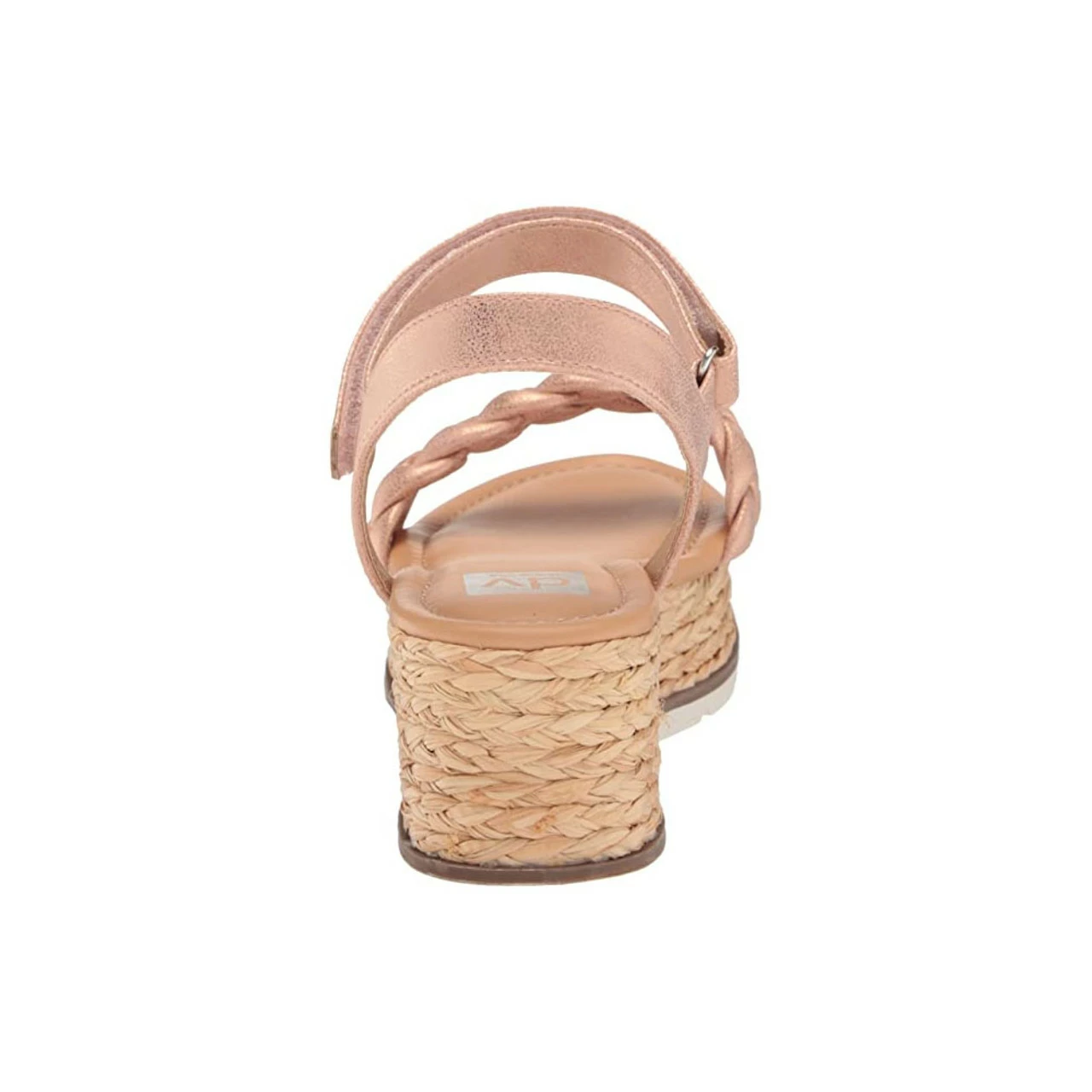 Girls’ espadrille platform sandal with braided strap and hook and loop strap closure.