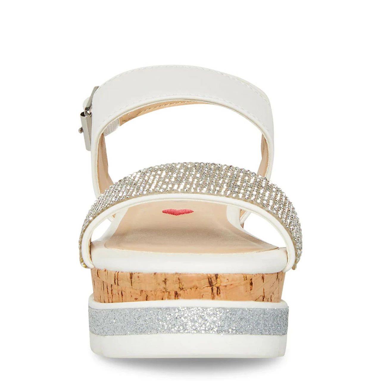 Glitter stacked on the sole and rhinestones embellished on the front strap give this cork wrap sandal texture.