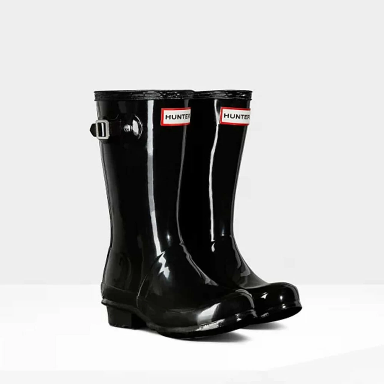 A mini version of the iconic Original Tall Boot, the Original Kids Gloss Rain Boot is a dream for junior explorers. This classic Hunter black waterproof boot is handcrafted from natural rubber with a gloss finish. Designed for adventures, our specialised kids boots are highly resistant to wear and abrasion with a polyester lining for comfort. Reflective patches and the Hunter Original tread offer added safety so you can be confident letting them take on the elements whatever the weather.