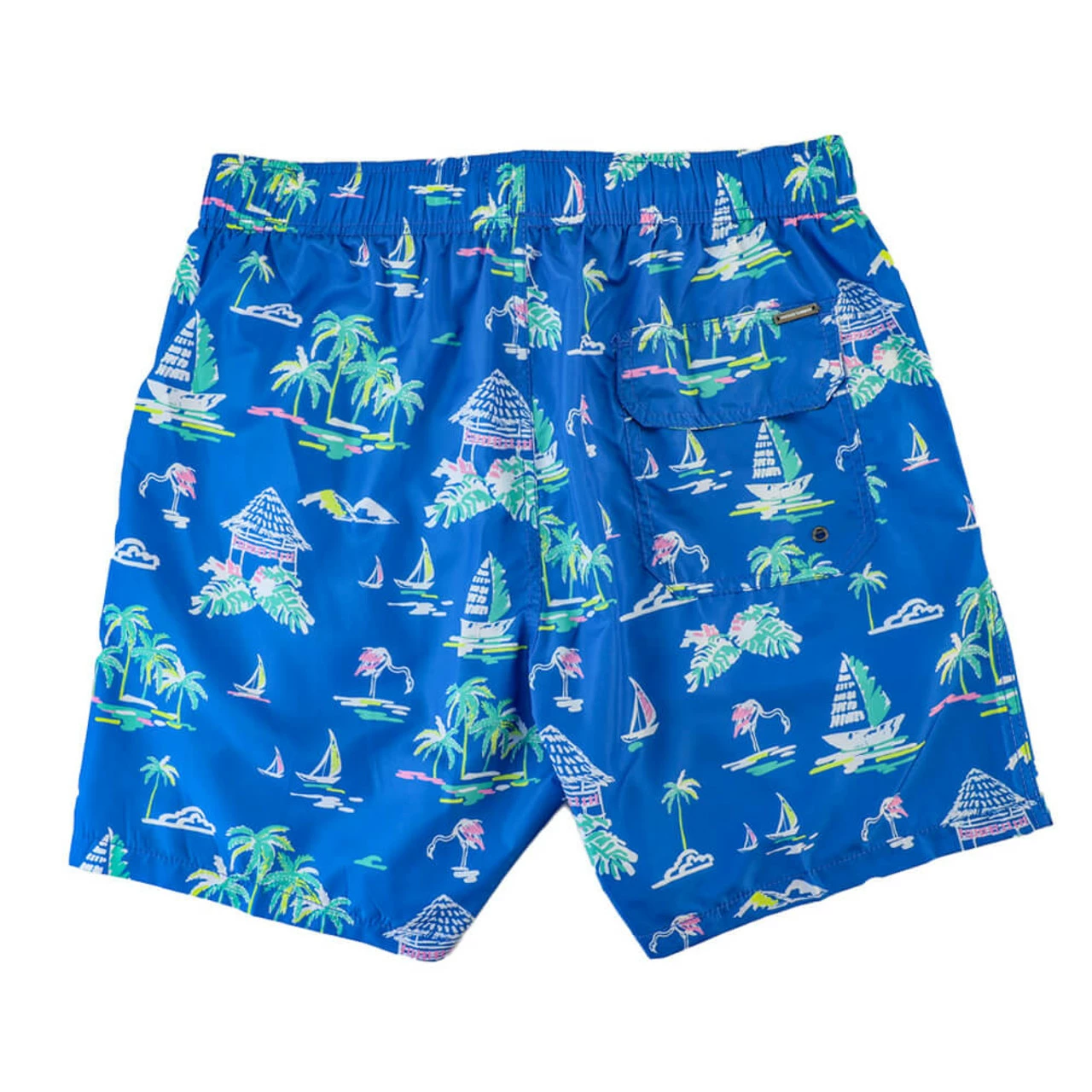 Swim in style with these comfortable swim shorts. They feature bright neon graphic pictures on a bright blue background. Pair them easily with a day spent at the pool or beach.