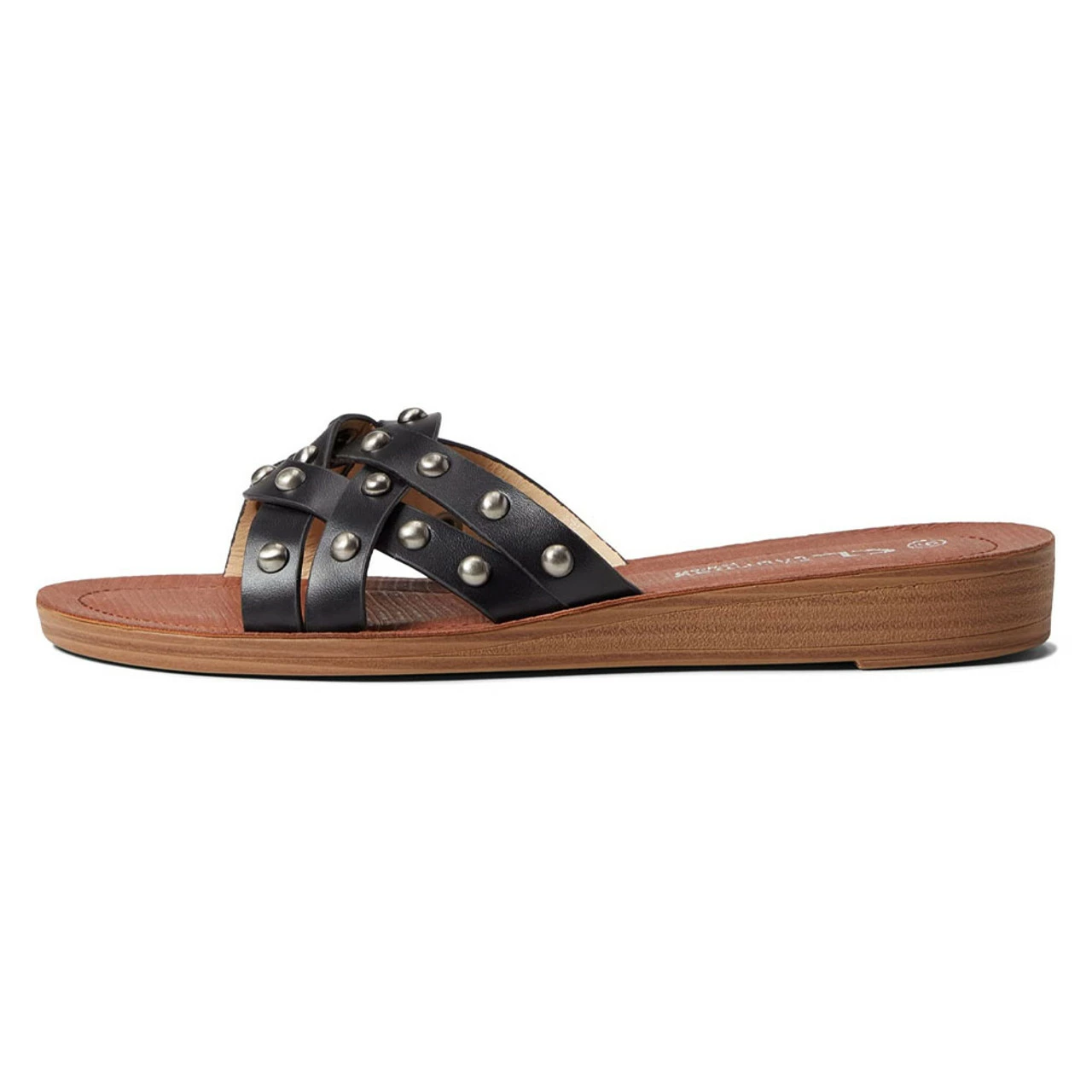 An easy addition to your footwear for simple nights out, this slip on sandal accentuates your style with it’s studs on the crisscross straps.